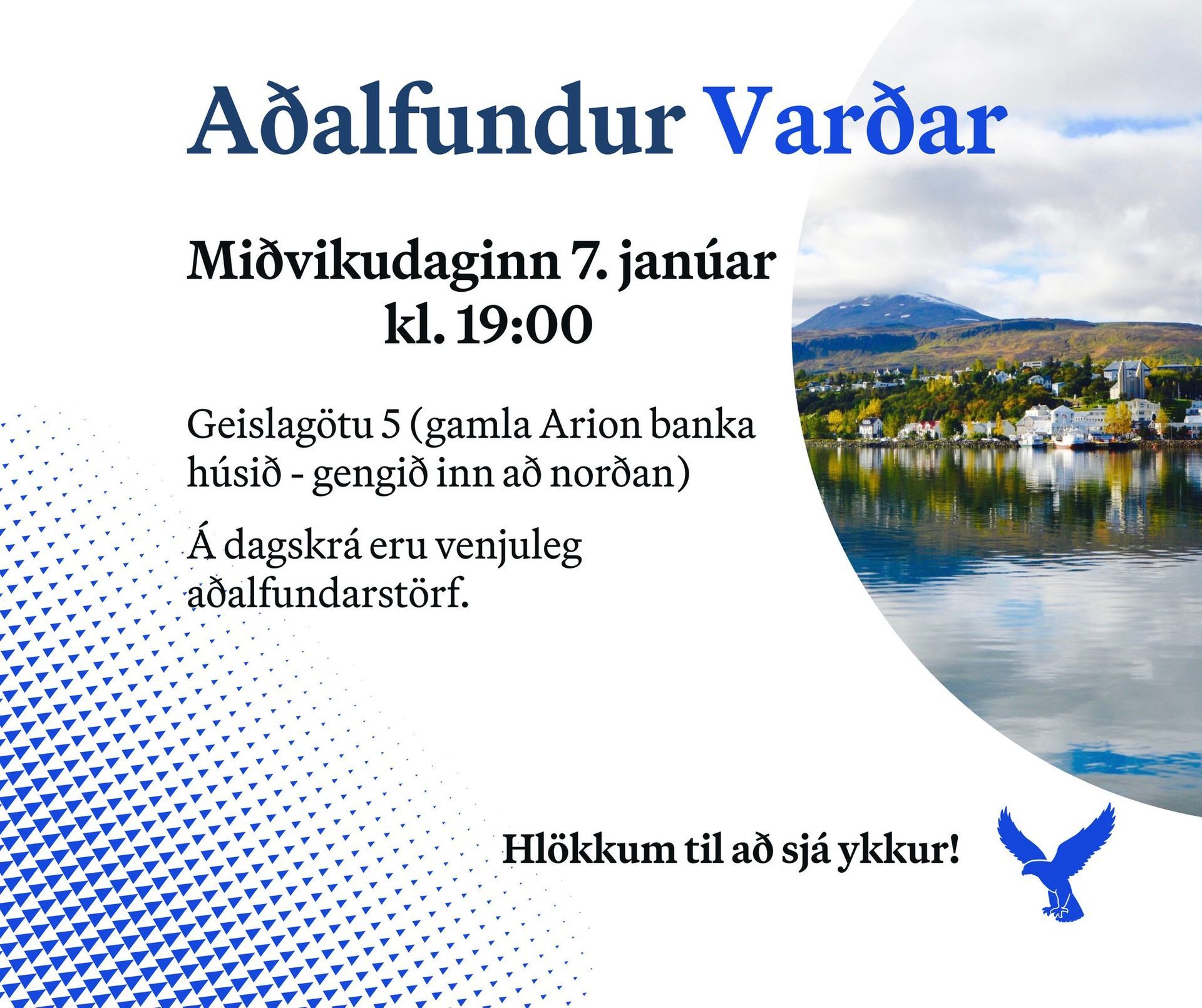 Kæri félagsmaður Varðar Boðað er til aðalfundar Varðar miðvikudaginn 7. janúar kl. 19:00 í Geislagötu 5 (gamla Arion banka húsið - gengið inn að norðan). Dagskrá: 1) Kosning fundarstjóra og fundarritara 2) Skýrsla stjórnar 3) Skýrsla gjaldkera 4) Lagabreytingar 5) Umræður og afgreiðsla stjórnmálaályktunar 6) Kynning á framboðum til formanns 7) Kosning formanns 8) Kynning á framboðum til stjórnar 9) Kosning stjórnar 10) Aðrar kosningar 11) Önnur mál Vakin er athygli á því að hægt er að skila inn framboði í pósti til formanns ( isaksvavars04@gmail.com ), í formsskjali hér að neðan eða með því að bjóða sig fram á fundinum sjálfum. Lagabreytingartillögur þurfa að berast formanni í pósti ( isaksvavars04@gmail.com ) eða í formsskjali hér að neðan, eigi síðar en tveimur sólarhringum fyrir fundinn. Óskað er eftir að stjórnmálaályktanir berist með sama fyrirvara og á sama tölvupóstfang og lagabreytingartillögurnar. Framboð til stjórnar: https://forms.gle/9nyJK96bJSEqLCQG7 Lagabreytingartillögur: https://forms.gle/QcSbmHpr29EpCXw26 Fyrir hönd stjórnar Varðar, Ísak Svavarsson Formaður
