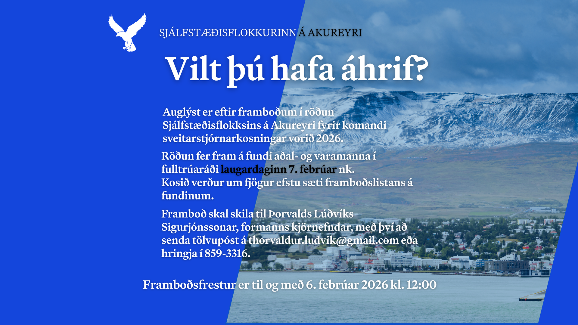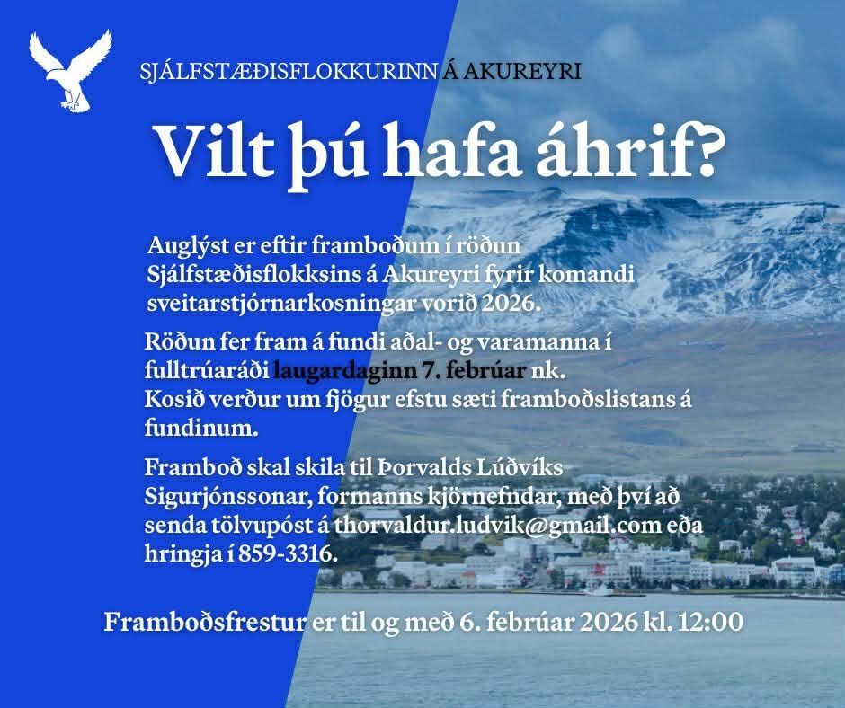 Ákveðið hefur verið að röðun um val frambjóðenda Sjálfstæðisflokksins á Akureyri við næstu sveitarstjórnarkosningar fari fram á fundi aðal- og varamanna í fulltrúaráði laugardaginn 7. febrúar nk. Kosið verður um fjögur efstu sæti framboðslistans á fundinum. Hér með er auglýst eftir framboðum til setu á framboðslista. Framboð skal bundið við flokksbundinn einstakling. Frambjóðendur skulu vera kjörgengir í sveitarstjórnarkosningum 16. maí 2026. Framboðsfrestur er til og með 6. febrúar 2026 kl. 12:00 Kjörnefnd er heimilt að tilnefna frambjóðendur til röðunar til viðbótar við þá sem bjóða sig fram eftir að framboðsfresti lýkur. Val á framboðslista og röðun í sæti verður samkvæmt samræmdum reglum Sjálfstæðisflokksins við röðun á lista. Samræmdar reglur um Röðun Hægt er að fá nánari upplýsingar um röðun og skila inn framboði með því að hafa samband við Þorvald Lúðvík Sigurjónsson , formann kjörnefndar, með því að senda tölvupóst á thorvaldur.ludvik@gmail.com eða hringja í 859-3316 .